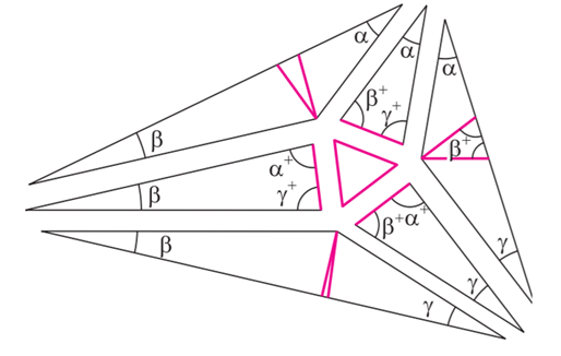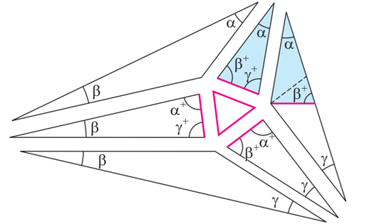 α-ն ու β+ -ը, և հավասար կողմ (նկարում կարմիր է, հավասար է հավասարակողմ եռանկյան կողմին): Այդ դեպքում երկու եռանկյունիների հարակից կողմերի երկարությունները հավասար են։ Կիրառելով այդ դիտարկումները վեց անգամ՝ մենք կպարզենք, որ նկարի բոլոր հարակից կողմերը իրար հավասար են, և դրանով իսկ կհասատատենք, որ վեց եռանկյունիները հարակից են իմ հավասարակողմ եռանկյանը, եթե միայն յուրաքանչյուր ներքին գագաթի անկյունների գումարը 360 աստիճան է: Ցանկացած ներքին գագաթի դեպքում, անկյունների գումարը հավասար է (α++ β++ + γ + + 0+ ), որը 5 հատ + նշան է, որը կազմում է 300 աստիճան, իսկ α+ β+ γ , որը արդյունքում հենց տալիս է 360 աստիճան (նկ․ 8):