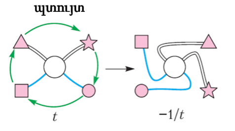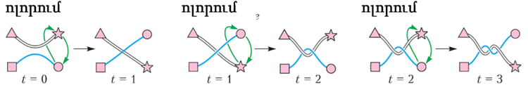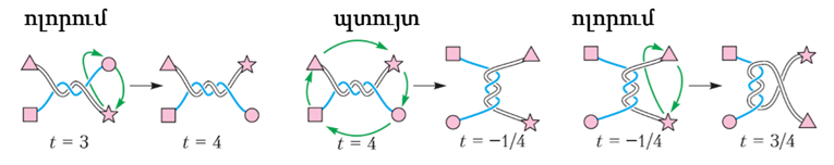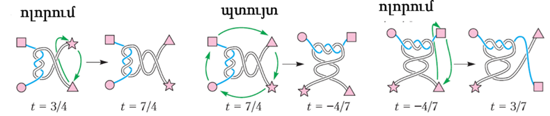 Սկսենք նրանից, որ նկար 24 -ի խճճվածքին տանք t=0 արժեքը։ Դիտարկենք շարժումների կամայական հաջորդականությունը (նկ. 25): Ձեր խնդիրն է, հարգելի՛ ընթերցող, պարողներին վերադարձնել զրոյի: Բայց ձեզ թույլատրվում է անել միայն այն երկու շարժումները, որոնց մասին ես խոսեցի։ Ցանկանում եք պտտվե՞լ, թե՞ շրջվել: