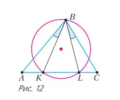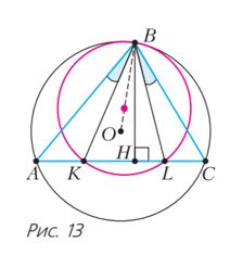 Խնդիր 5։ Տրված է սուրանկյոսւն եռանկյուն ABC։ կողմի վրա ընտրված է կամայական K կետ և այնպիսի L կետ, որ <ABK = <CBL (տես նկ․ 12)։ Ապացուցել, որ ABC և KBL եռանկյուններին արտագծած շրջանագծերի կենտրոնները գտնվում են միևնույն ուղու վրա։