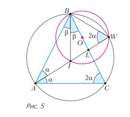 1․ Եթե O կետը սուրանկյուն եռանկյուն IBW-ին արտագծած շրջանագծի կենտրոնն է։ Այդ դեպքում՝ ∠IBO=90∘−2α, ըստ հիմնական փաստի։ Մյուս կողմից՝ ∠IBL=∠IBC=β