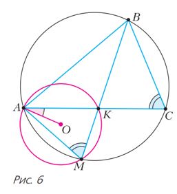 Խնդիր 2։ ABC -ն սուրանկյուն եռանկյուն է։ Ցանկացած ուղիղ, որն անցնում է B գագաթով, հատում է AC կողմը K կետում, իսկ եռանկյուն ABC-ին արտագծած շրջանագիծը՝ M կետում։ Ապացուցեք, որ բոլոր այդպիսի AMK եռանկյուններին արտագծած շրջագծերի կենտրոնները գտնվում են միևնույն ուղիղի վրա (տես նկ. 6)։