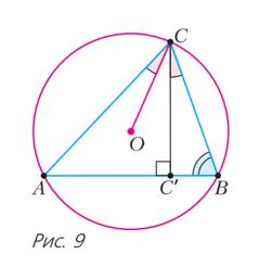 CC՛ -ն սուրանկյուն եռանկյուն ABC-ի բարձրությունն է (տես նկ. 9)։ O կետը եռանկյանն արտագծած շրջագծի կենտրոնը։ Այդ դեպքում ∠ACO=∠BCC՛, այսինքն՝ CO և CC՛ ուղիղները համաչափ են ABC եռանկյան C գագաթի անկյան կիսորդի նկատմամբ։