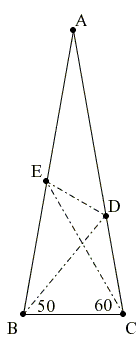 Դիցուք ունենք ABC հավասարասրուն եռանկյուն (AB = AC), որի ∠BAC = 20°։ D կետը AC կողմի վրա վերցված է այնպես, որ ∠CBD=50° , Е կետը վերցված է AB կողմի վրա այնպես, որ ∠BCE = 60°։ Գտեք ∠CED -ի աստիճանային չափը։