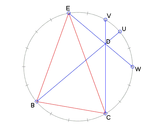 Մի քանի լարեր՝ BU, CV, EW, հատվում են մի կետում, նշանակենք այն D-ով։ Օգտվելով Պրասոլովում առաջարկած Չևիի թեորեմից` տեսնում ենք հետևյալ նույնությունը, որն էլ պատրաստվում ենք ապացուցել։