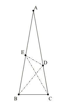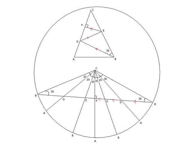(Վերադառնանք վերևում գտնվող եռանկյանը), այսինքն՝ F-ը AC-ի միջնակետն է։ Այսպիսով, ACE եռանկյունը հավասարասրուն է, հետևաբար CAE անկյան աստիճանային չափը 200 է։