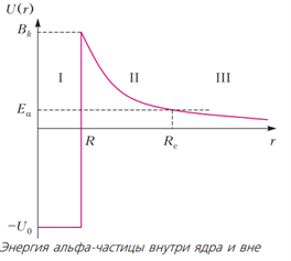 Պոտենցիալ էներգիայի կախվածությունը միջուկի ներսում եղած հեռավորությունից որոշվում է միջուկային ձգողականության ուժերով (դրանք շատ ավելի մեծ են, քան էլեկտրական վանողական ուժերը): Այս էներգիան բացասական նշան ունի, եթե պոտենցիալ էներգիան միջուկից հեռու համարենք զրոյական։ Այդպիսի կախվածությունը սովորաբար անվանում են «պոտենցիալ փոս»։ Սակայն միջուկից դուրս միջուկային ուժերը դադարում են գործել, և մնում են միայն էլեկտրական ուժերը։ Նրանց պոտենցիալ էներգիան դրական է, քանի որ դրանք վանողական ուժեր են։ Հեռավորությանը հակադարձ համեմատական՝ այն ձգտում է զրոյի։
