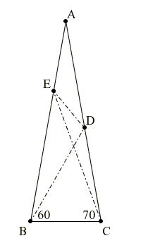 Դիցուք ունենք ABC հավասարասրուն եռանկյուն (AB = AC), որի ∠BAC = 20°։ D կետը AC կողմի վրա վերցված է այնպես, որ ∠CBD=60° է, Е կետը վերցված է AB կողմի վրա այնպես, որ ∠BCE = 70°։ Գտեք CED անկյան աստիճանային չափը (տե՛ս նկարը)։