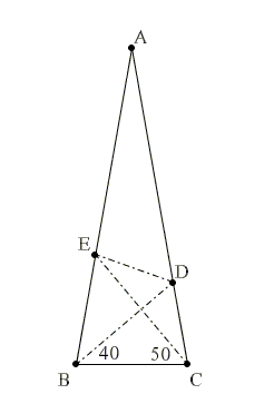 Քանի որ ∠BEC = 180° — 80° — 50° = 50°, ΔBCE-ն հավասարասրուն է։ Բացի այդ, ∠DBE = 80° — 40° = 40°, ինչը նշանակում է, որ BD-ն հավասարասրուն եռանկյան գագաթի անկյան կիսորդն է։ Այն նաև եռանկյան հիմքին տարված միջնագիծ է, ինչպես նաև՝ բարձրություն։