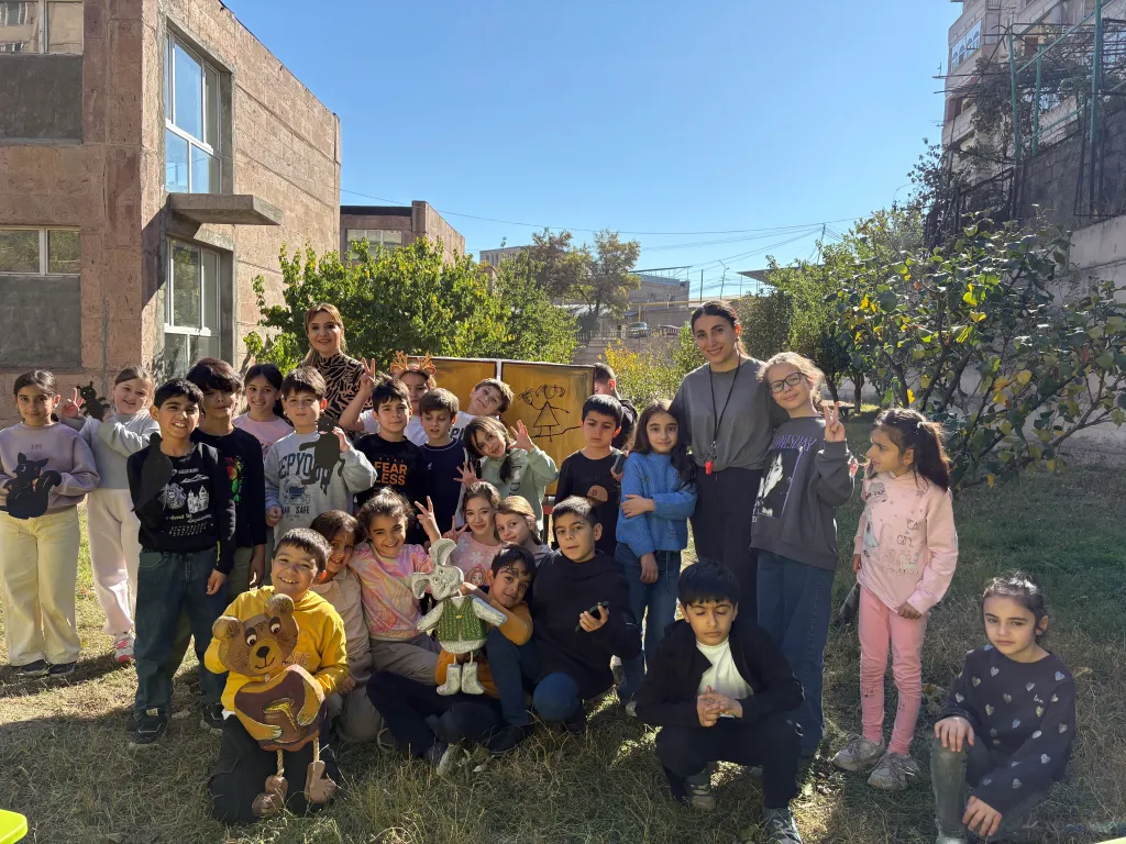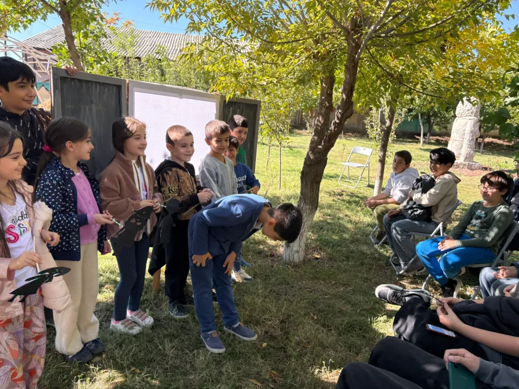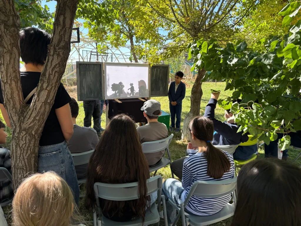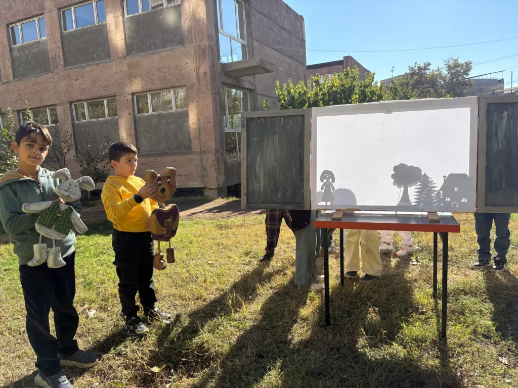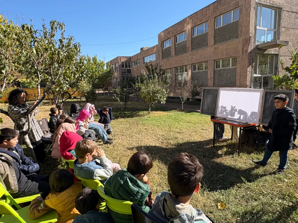 Մեր կրթահամալիրի կրտսեր դպրոցների բաց ու կանաչ տարածքները կարծես հատուկ ստեղծված են ստվերախաղի համար։ Եթե թատրոն-ավտոբուսի ներսում կարող էինք հյուրընկալել 10–20 հանդիսատես, ապա դրսում՝ ծառերի տակ, արևի լույսի ներքո(արևի ճառագայթները փոխարինում են ստվերների թատրոնի էկրանի լապտերին) կարող են հավաքվել 30, 40, նույնիսկ ավելի շատ սովորողներ։ Բացօթյա միջավայրը ազատում է, աշխուժացնում, իսկ ներկայացումները դառնում են ավելի ինտերակտիվ՝ խաղերով, շարժումներով, արձագանքներով ու անմիջական մասնակցությամբ։ Երեխաները ոչ միայն դիտում են, այլև ապրում են հեքիաթը՝ երբեմն նույնիսկ դառնալով ներկայացման մի մասնիկը։